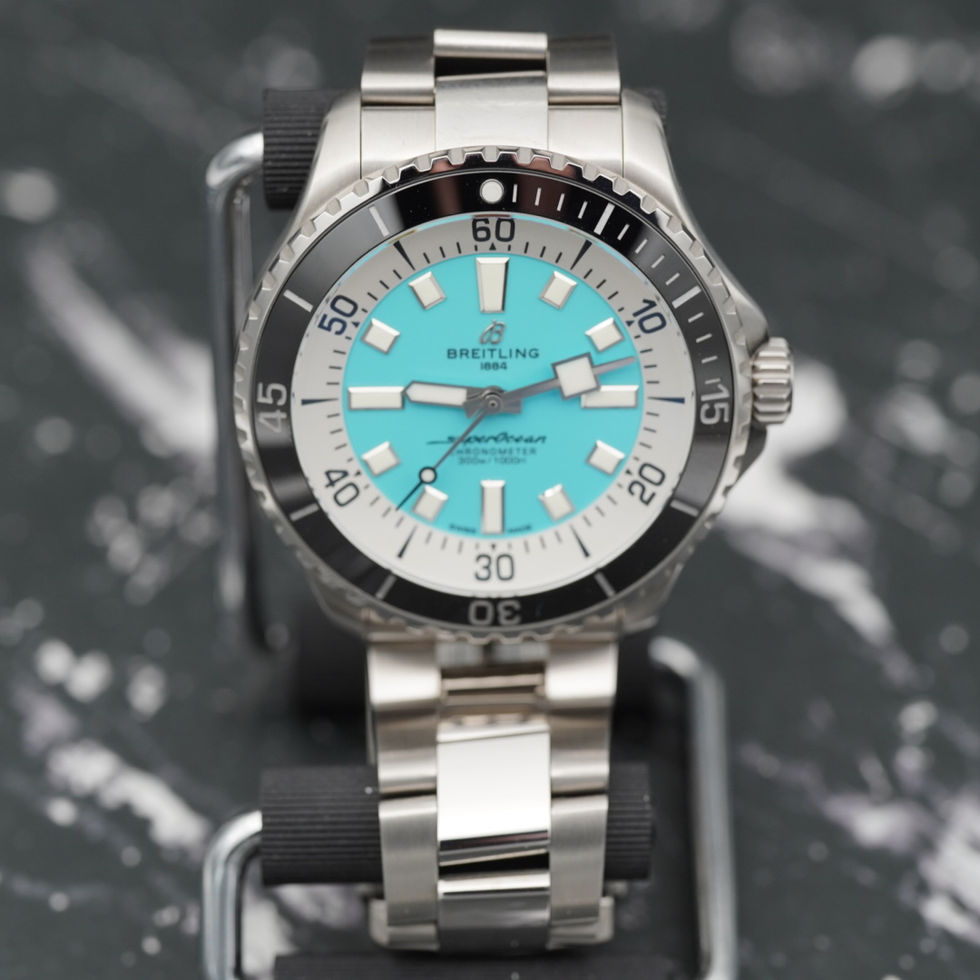 Description- Up for sale is this stunning, tiffany dial Breitling Superocean 44mm. Pictures do not do this dial justice! Pieces is in amazing shape and ready for you to wear.
